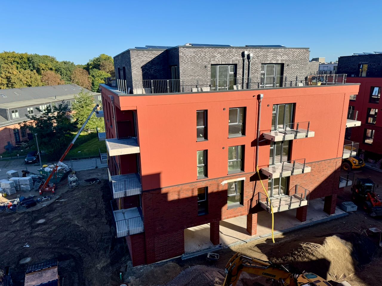 Ein wichtiger Meilenstein ist erreicht: Die Fassade des letzten Mehrfamilienhauses von Parkside IV wurde fertiggestellt. Damit präsentieren sich nun alle Tower in einem einheitlichen Erscheinungsbild mit der charakteristischen roten Klinkerfassade – ein architektonisches Highlight, das dem Quartier einen hochwertigen, stimmigen Gesamteindruck verleiht.